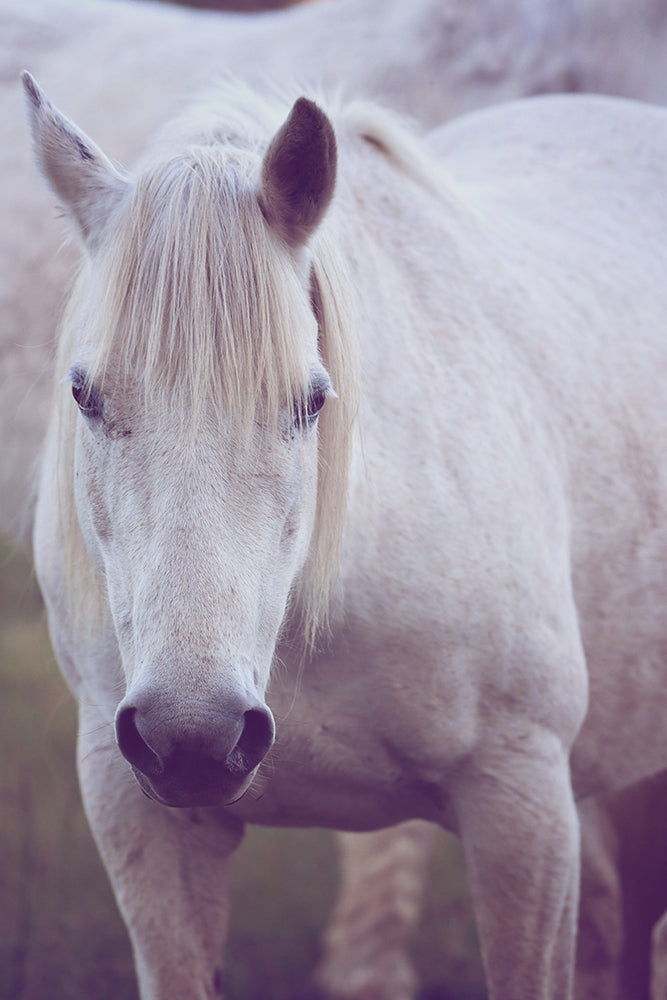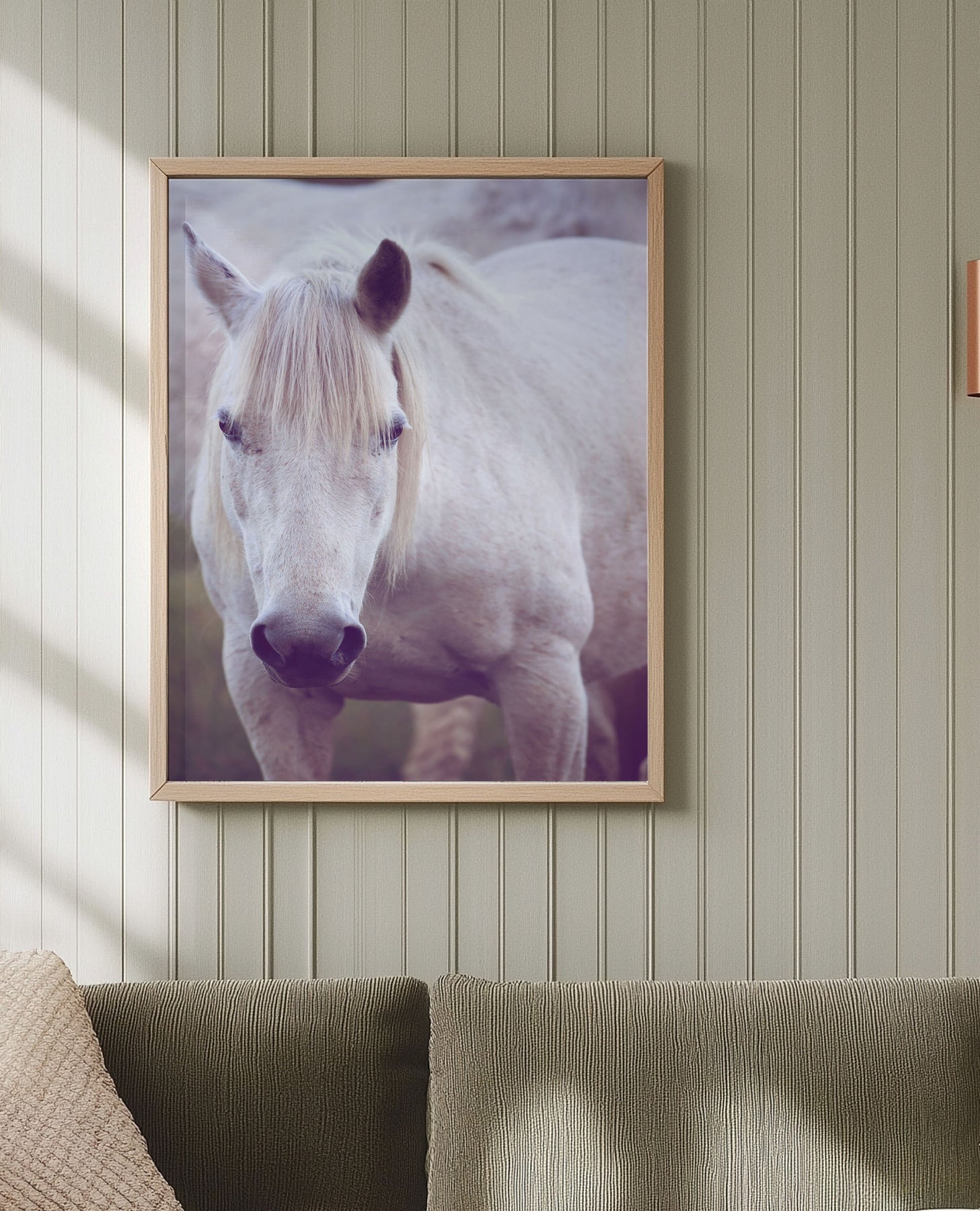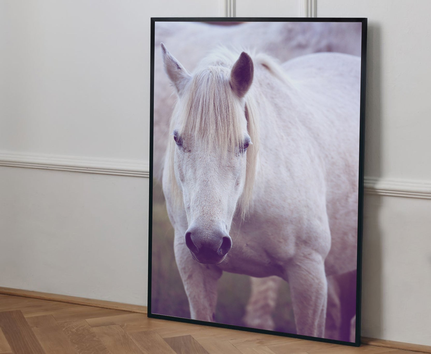 This gentle portrait captures the quiet soul of a white horse, its soft fringe falling over expressive eyes. The muted lilac tones create a serene, dreamlike atmosphere. A must for equine lovers.