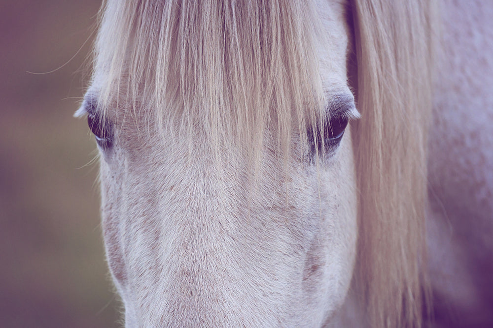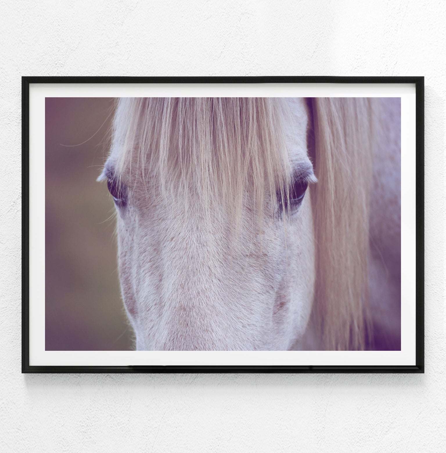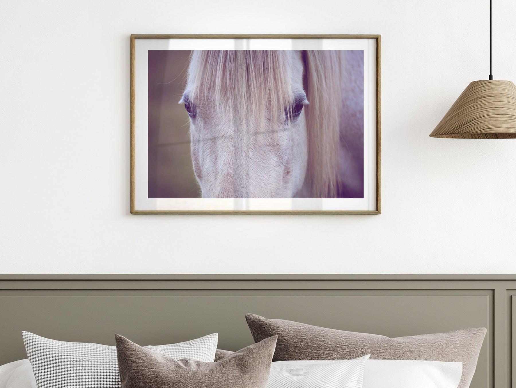 A gentle portrait that captures the soulful eyes of a white horse peeking through a soft fringe of pale mane. The close-up composition and muted pastel tones evoke calm and connection.