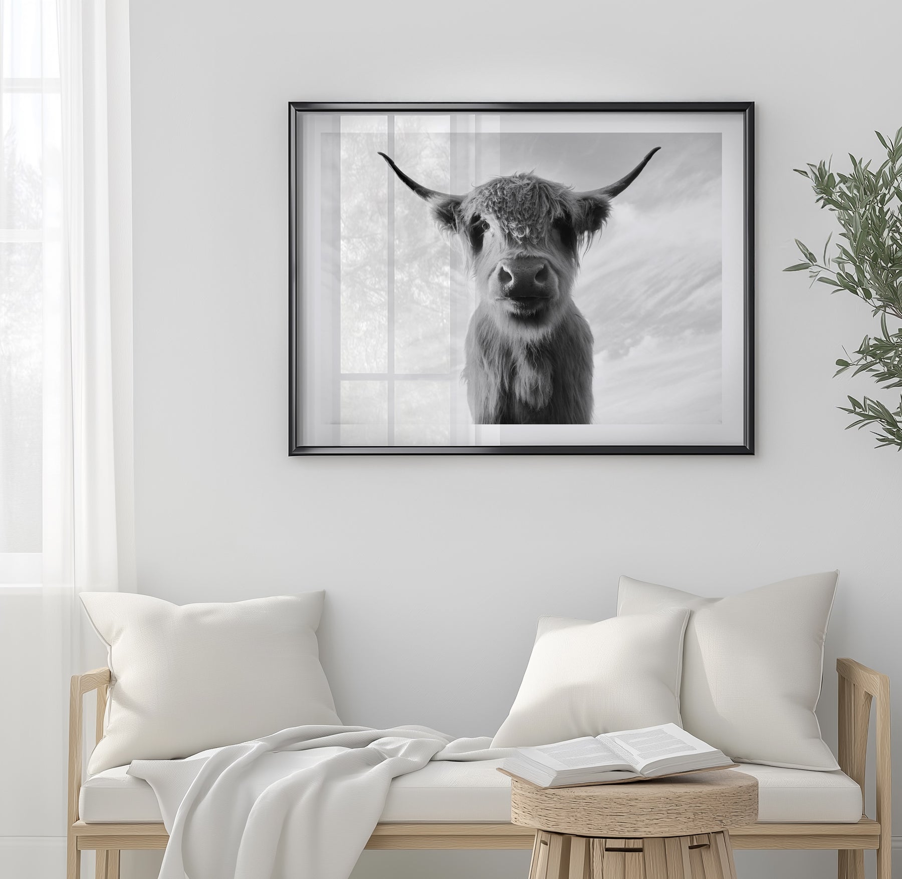 The contrast of soft hair and sharp horns captures the strength and elegance of this gentle giant. Perfect for monochrome interiors or rustic spaces.