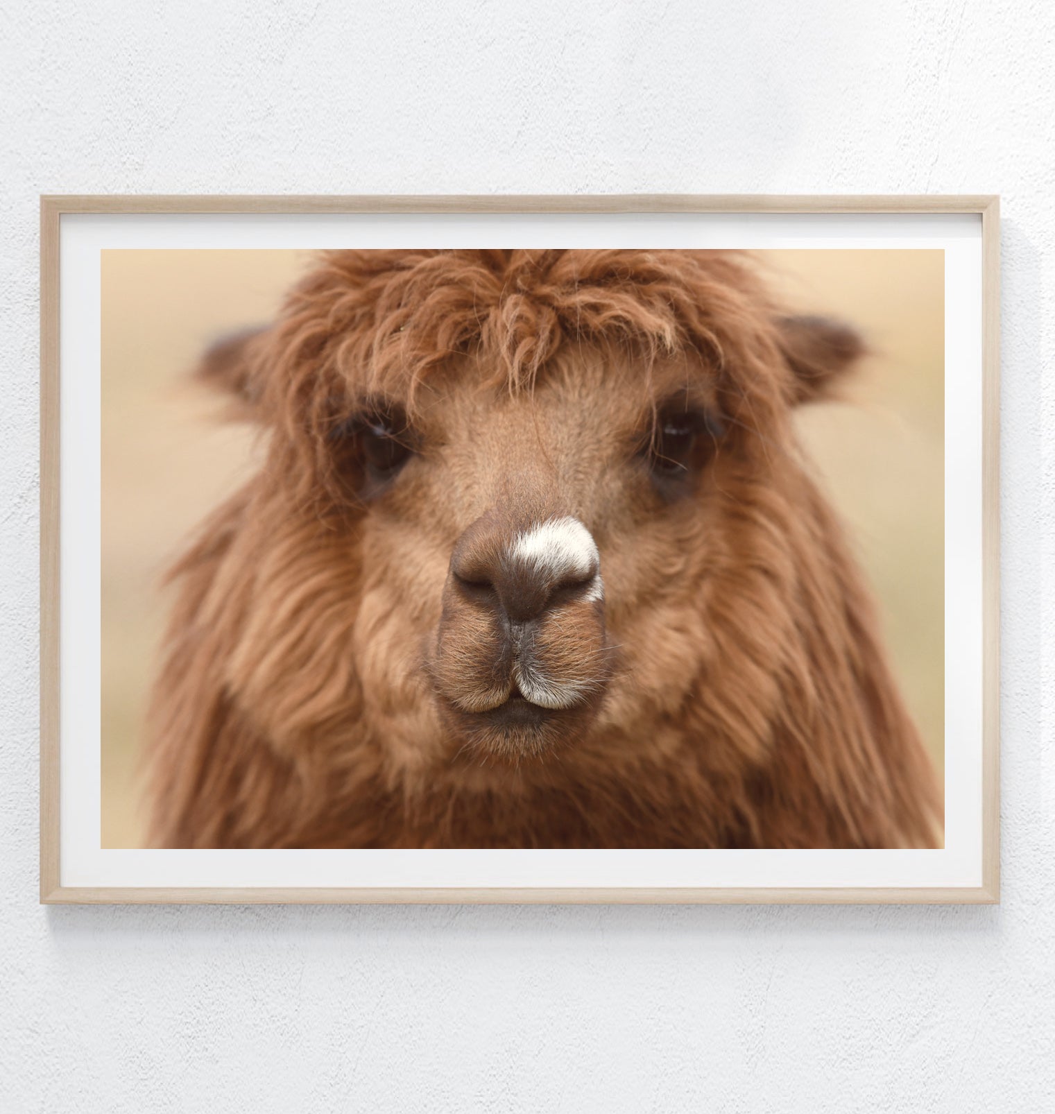 With his tousled fur and calm gaze, Bruce the Alpaca radiates quiet charm and gentle curiosity. This close-up portrait captures every soft detail, from his textured coat to his expressive eyes.