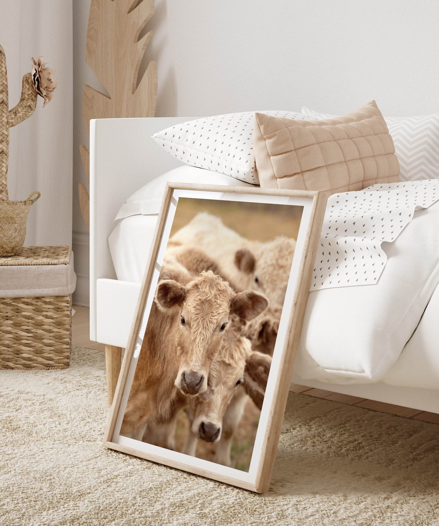 A tender moment captured in the quiet gaze of a curious young cow among its gentle herd. This warm portrait draws you in with soft textures and golden light.