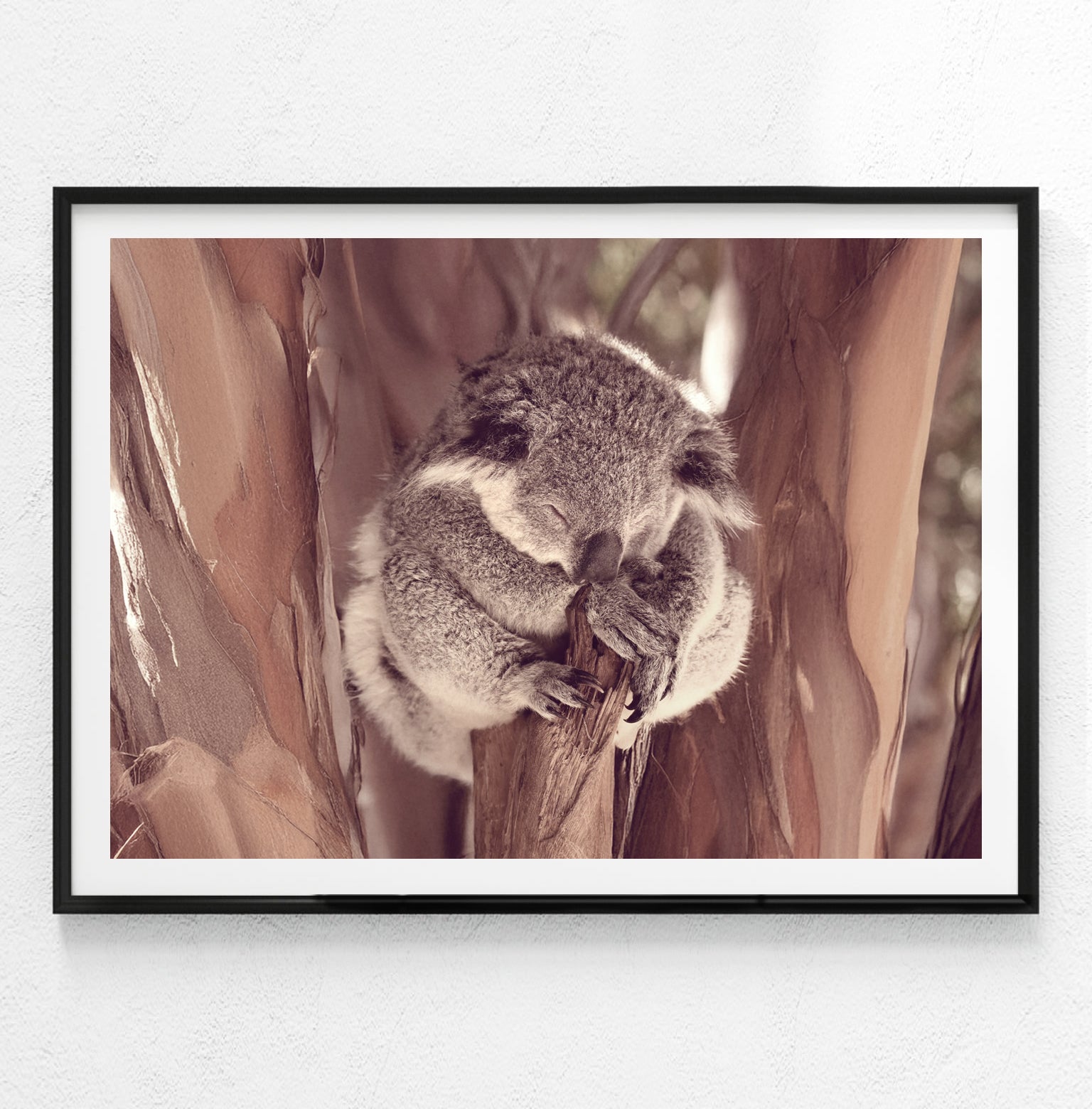 Nestled between the smooth trunks of gum trees, this sleepy koala embodies pure serenity and stillness. A tender moment of connection with nature, captured in soft light and gentle detail.