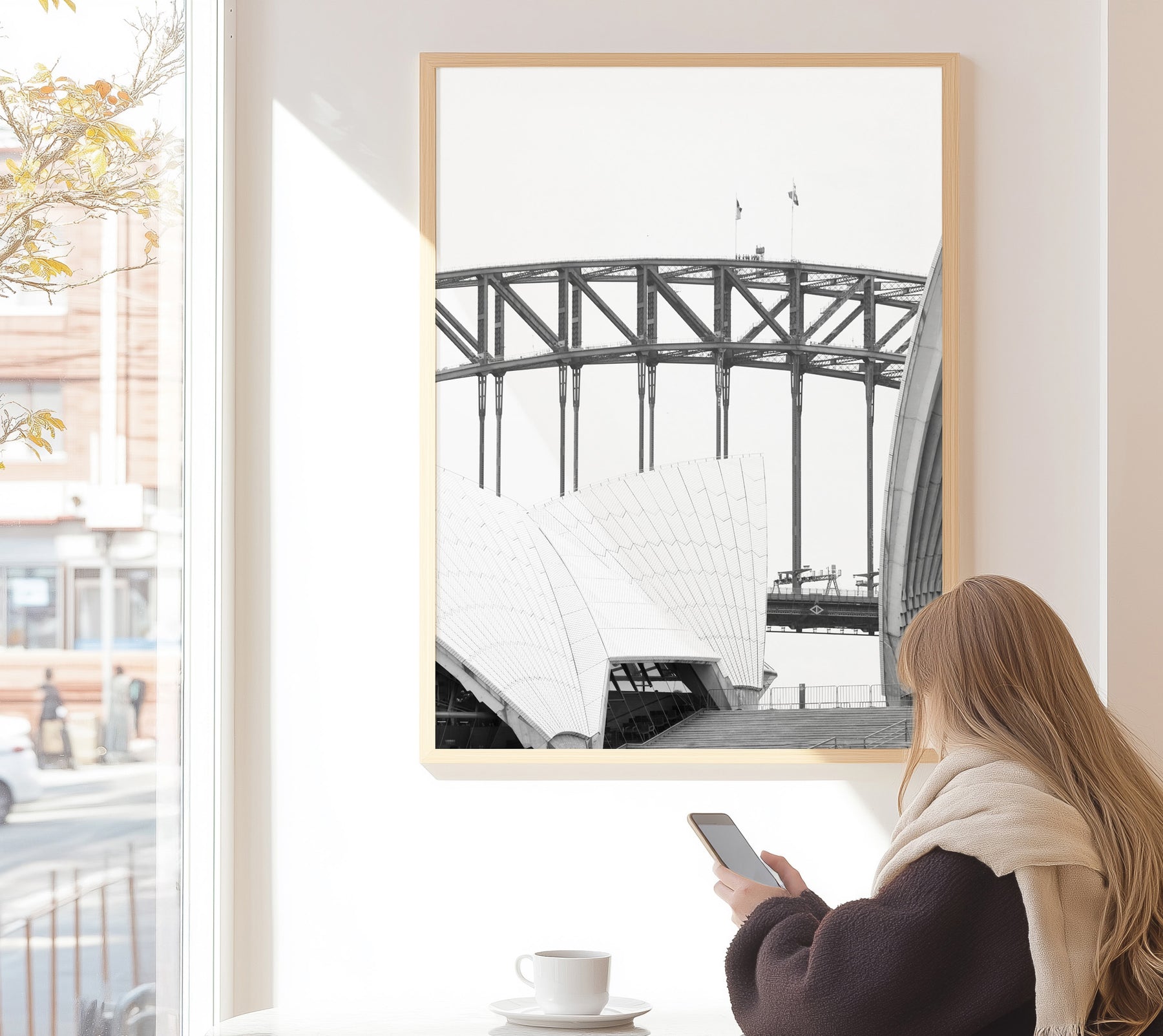 The striking silhouette of the Harbour bridge against a clear sky, the architecture timeless and strong. A striking piece for urban lovers and modern homes.