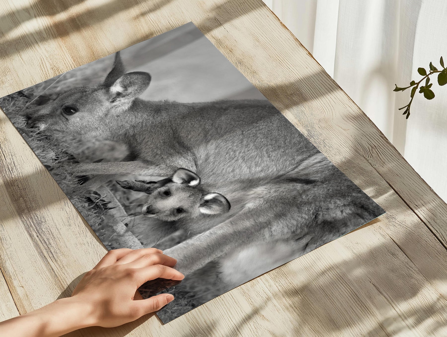 This black and white portrait captures innocence, curiosity, and the spirit of the bush. Perfect for nurseries or animal lovers.