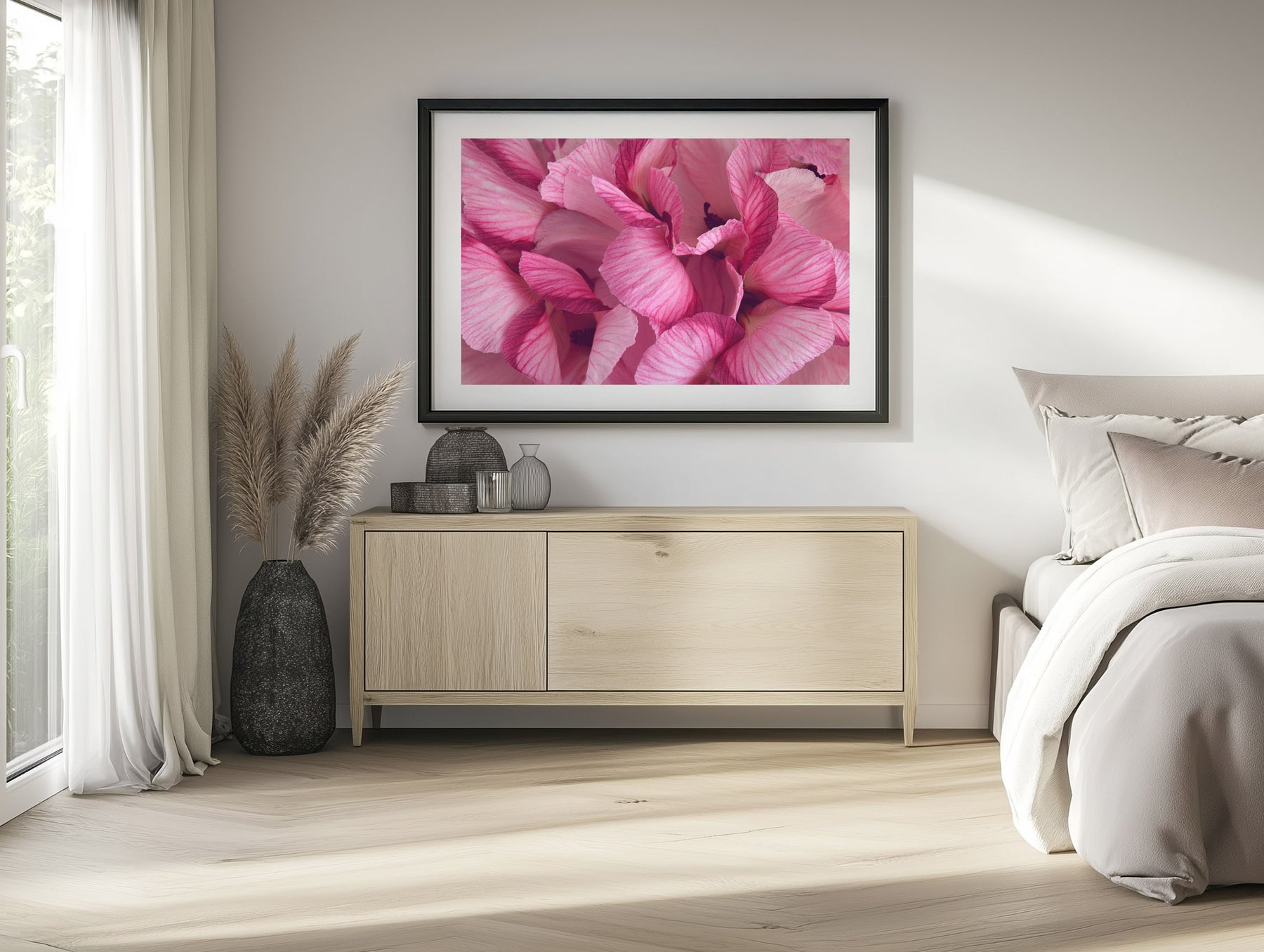 A vibrant symphony of veined petals in rich pink hues, this floral print captures the untamed beauty of the Australian native Hibiscus. The close-up composition reveals flowing textures and a natural elegance that adds warmth to any space.