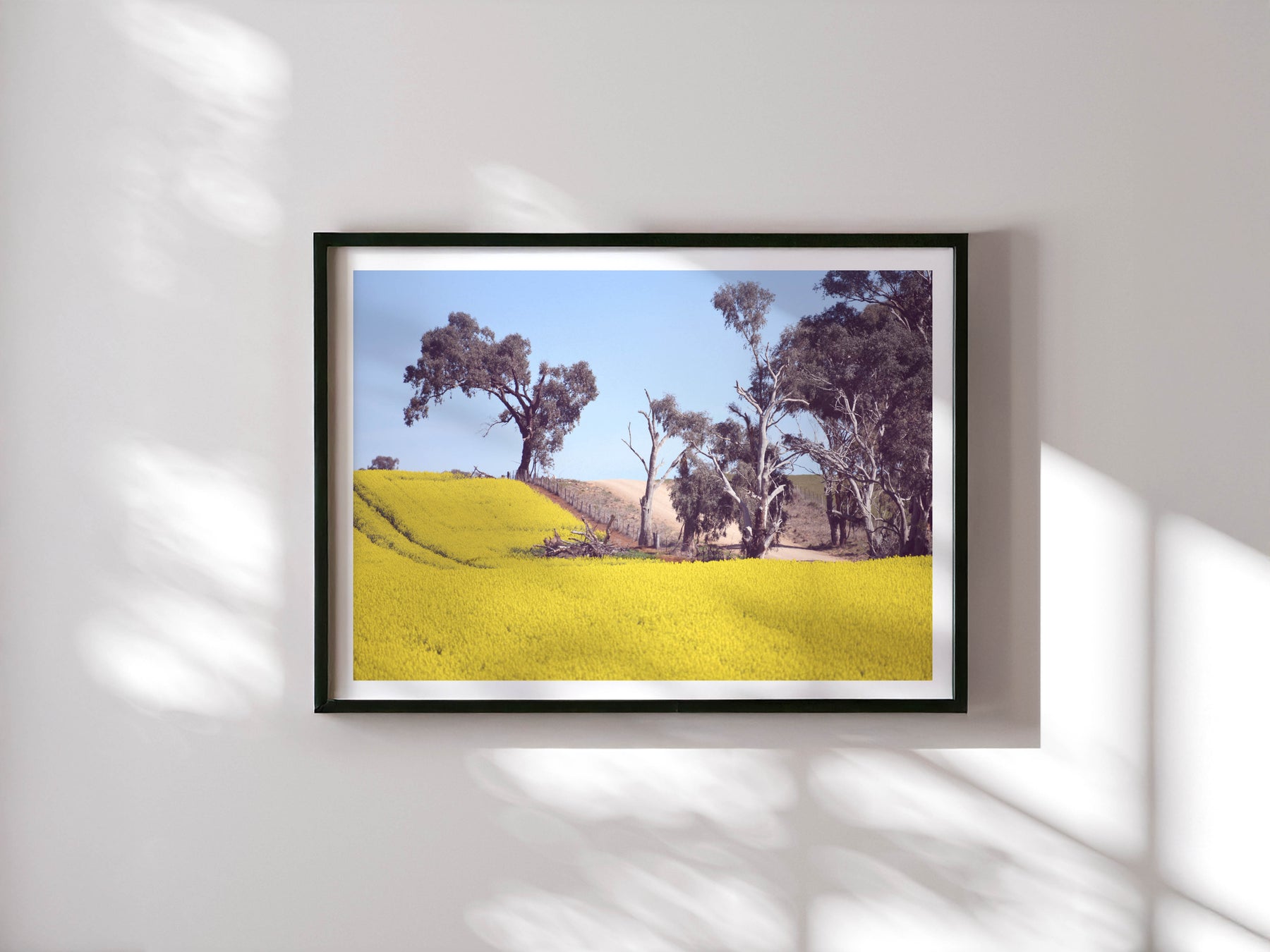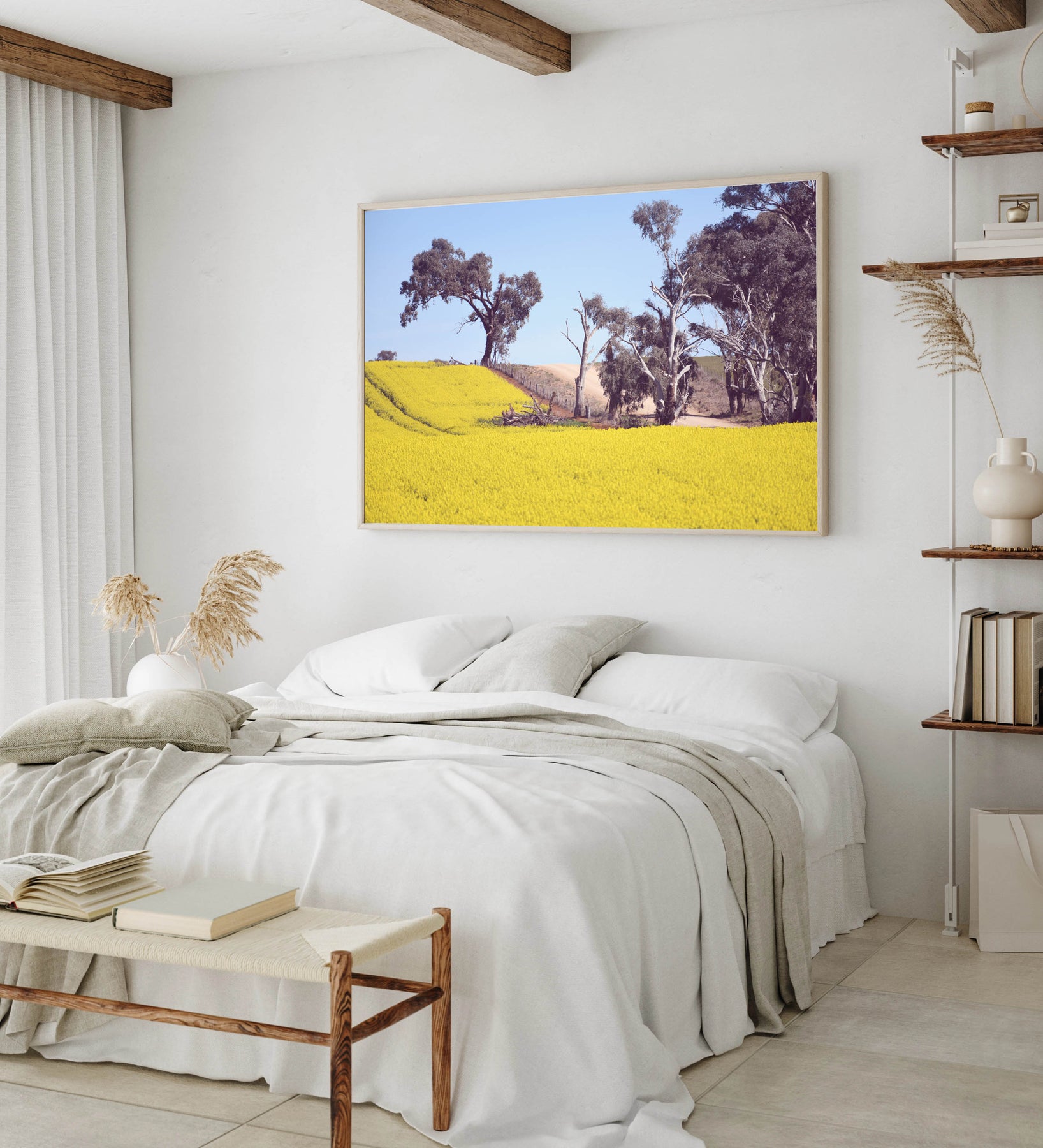 Golden canola blooms stretch endlessly under a clear blue sky in this tranquil rural scene from Cowra, NSW. The contrast of vibrant yellow fields with weathered eucalypts and a dusty country track creates a classic Australian landscape.