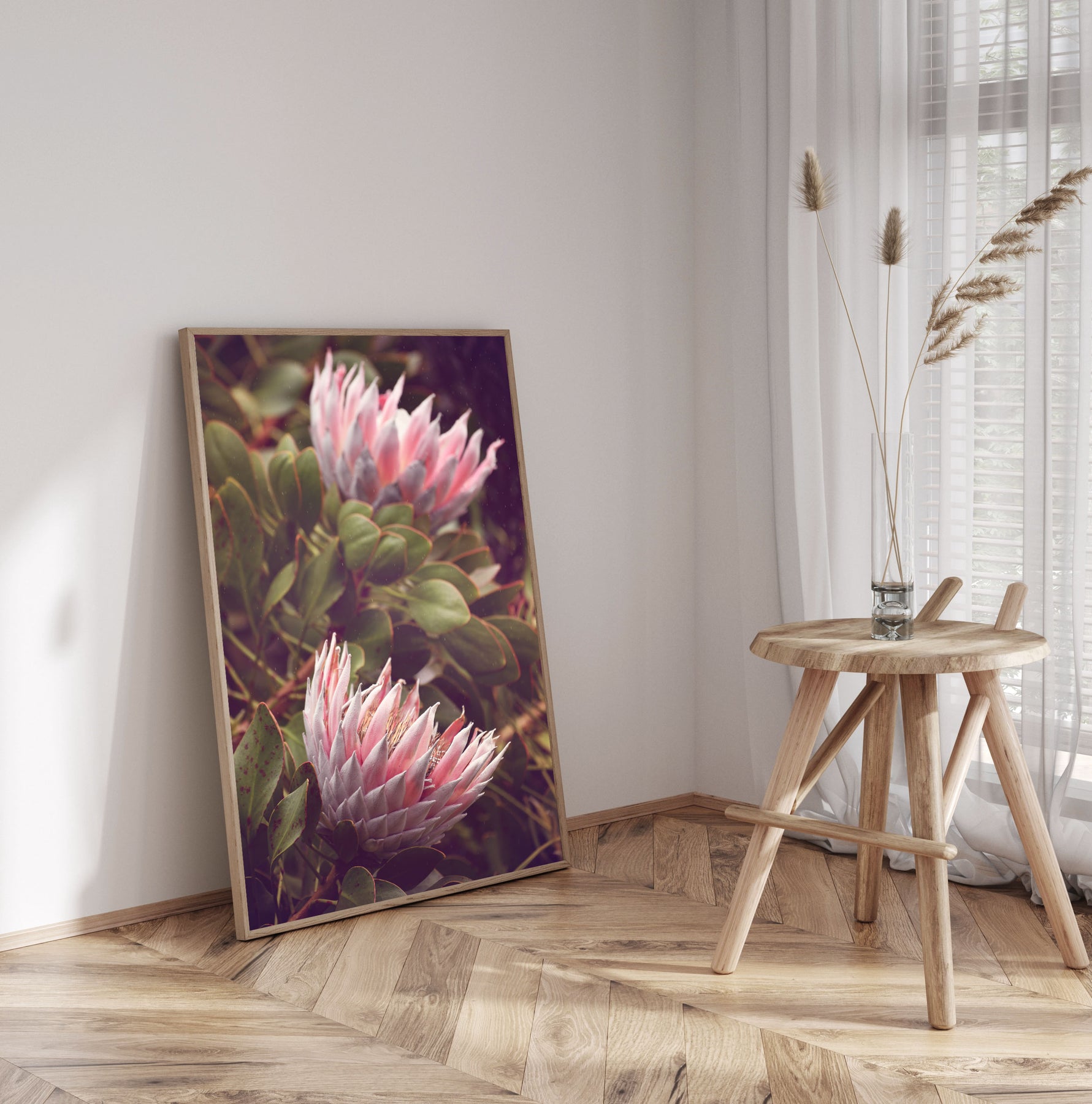 A regal bloom caught in full majesty, this close composition showcases two King Protea flowers glowing with soft pinks and silvery whites. Their sculptural form and lush foliage are brought to life in this fine art floral photograph.