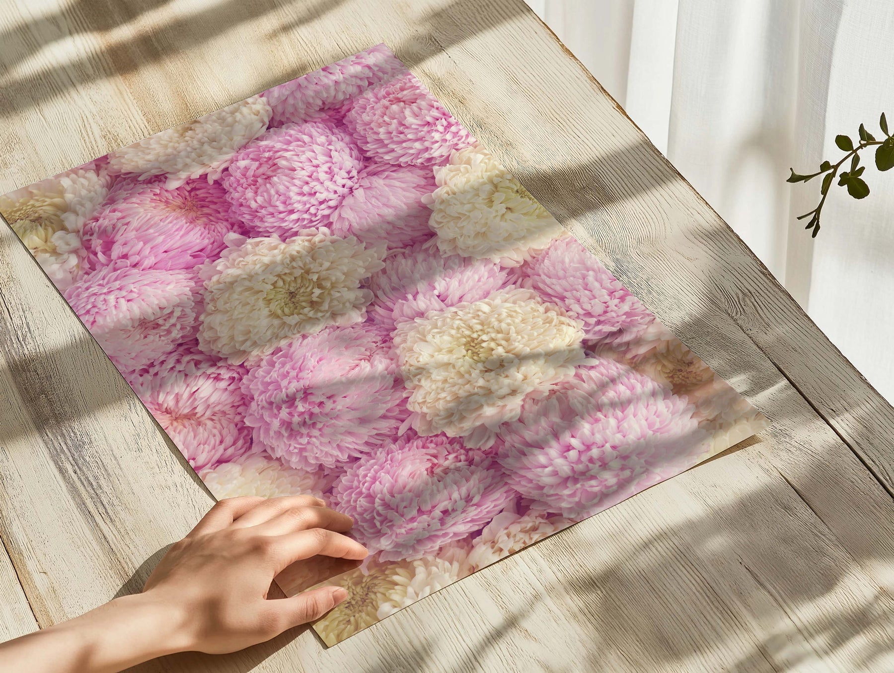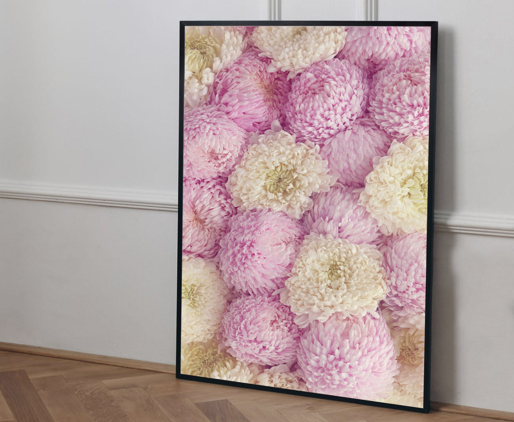 A dreamy blend of blush pink and creamy white blooms form a soft, romantic tapestry in this fine art floral photograph. Gentle light enhances the lush textures of each Chrysanthemum head, creating a serene and feminine atmosphere.