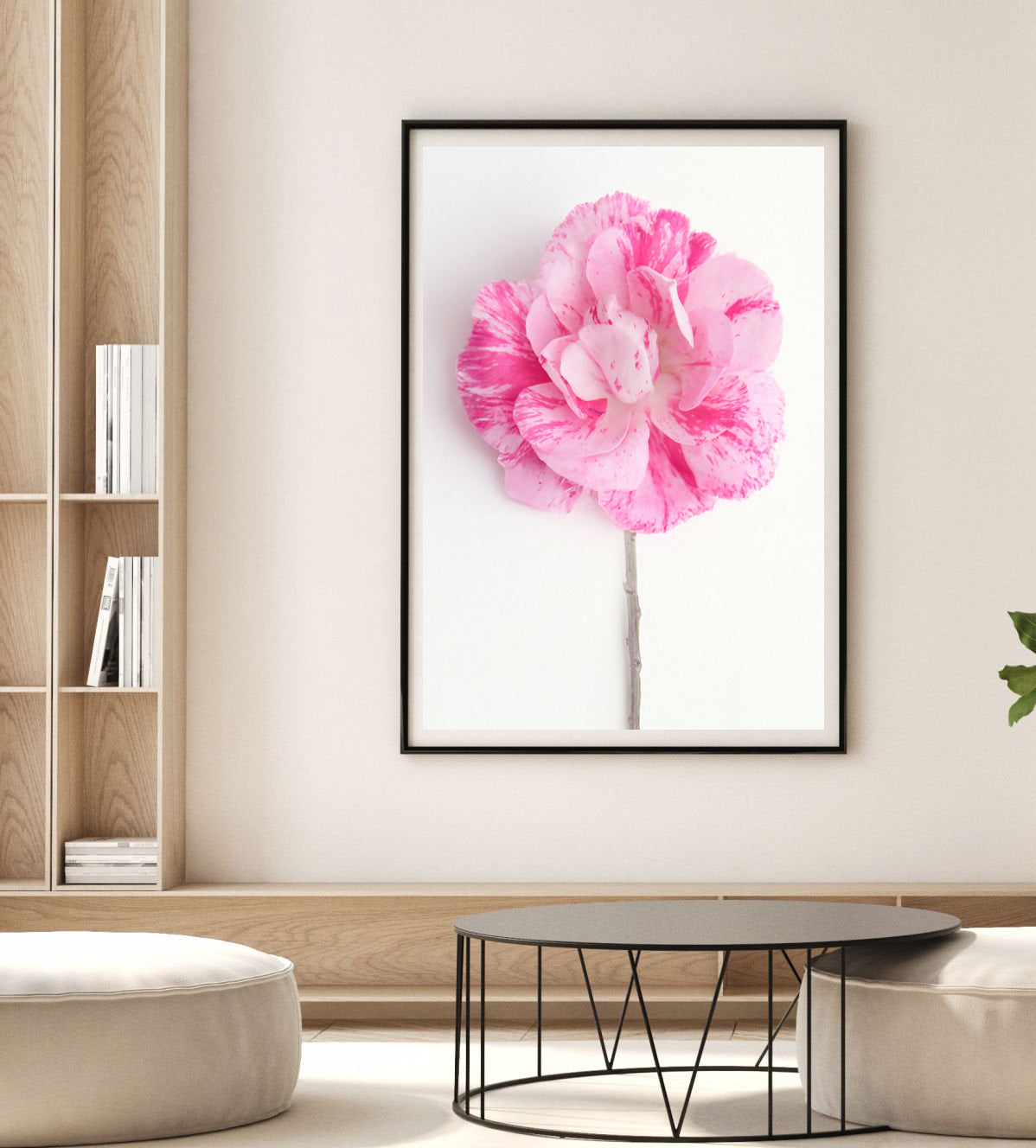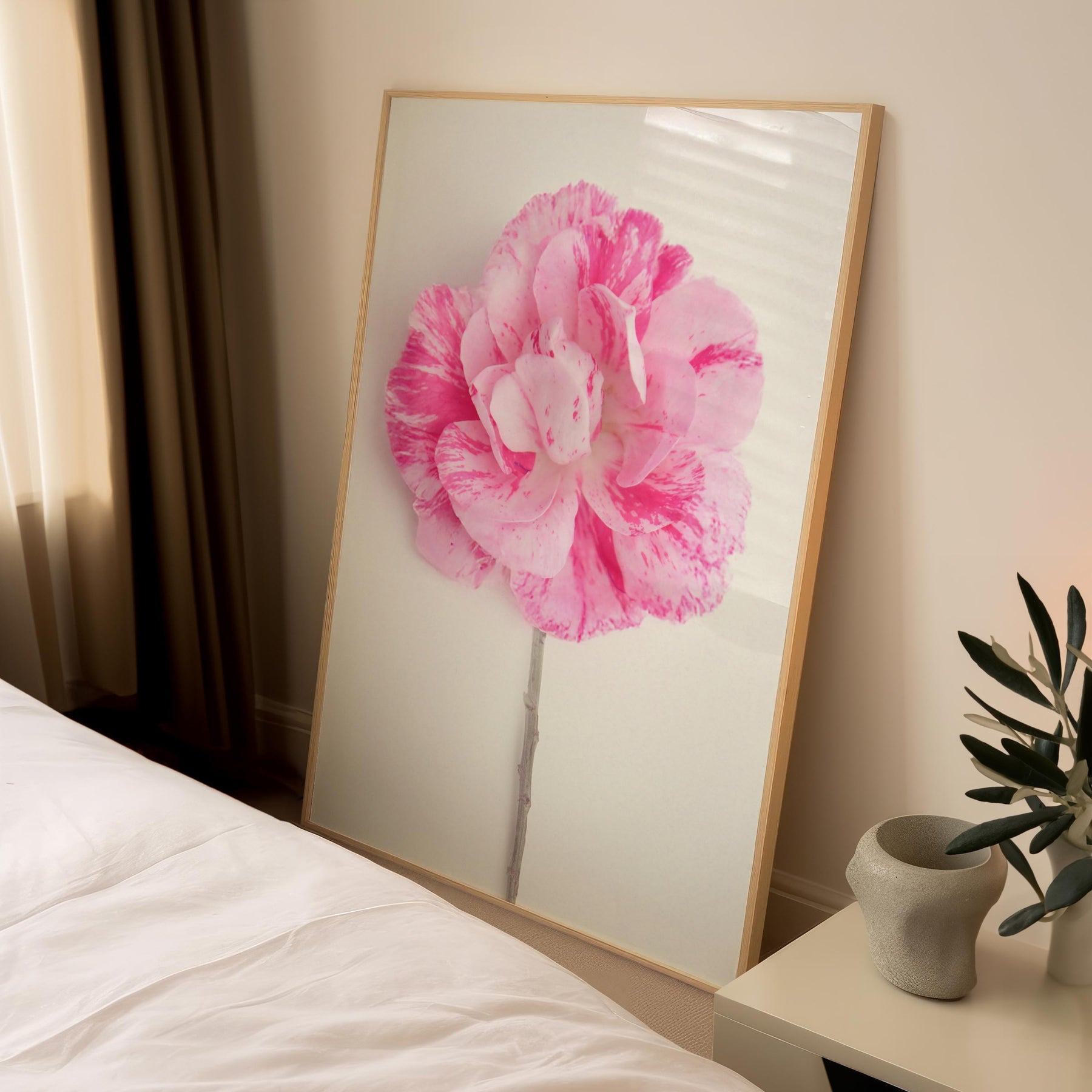 Soft and romantic, this floral portrait highlights the gentle swirl of blush and fuchsia petals with painterly detail. Each petal’s natural pattern creates a sense of movement and grace, evoking the timeless beauty of a freshly opened bloom.