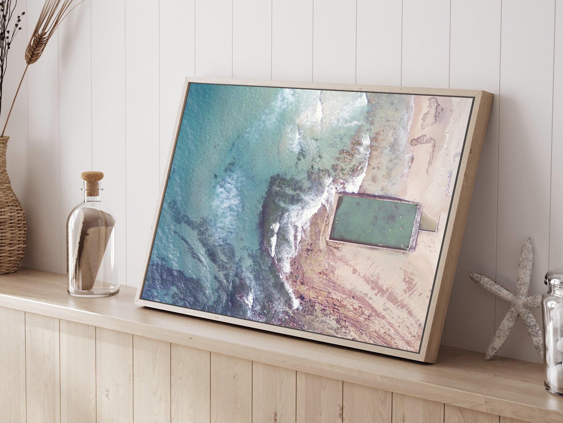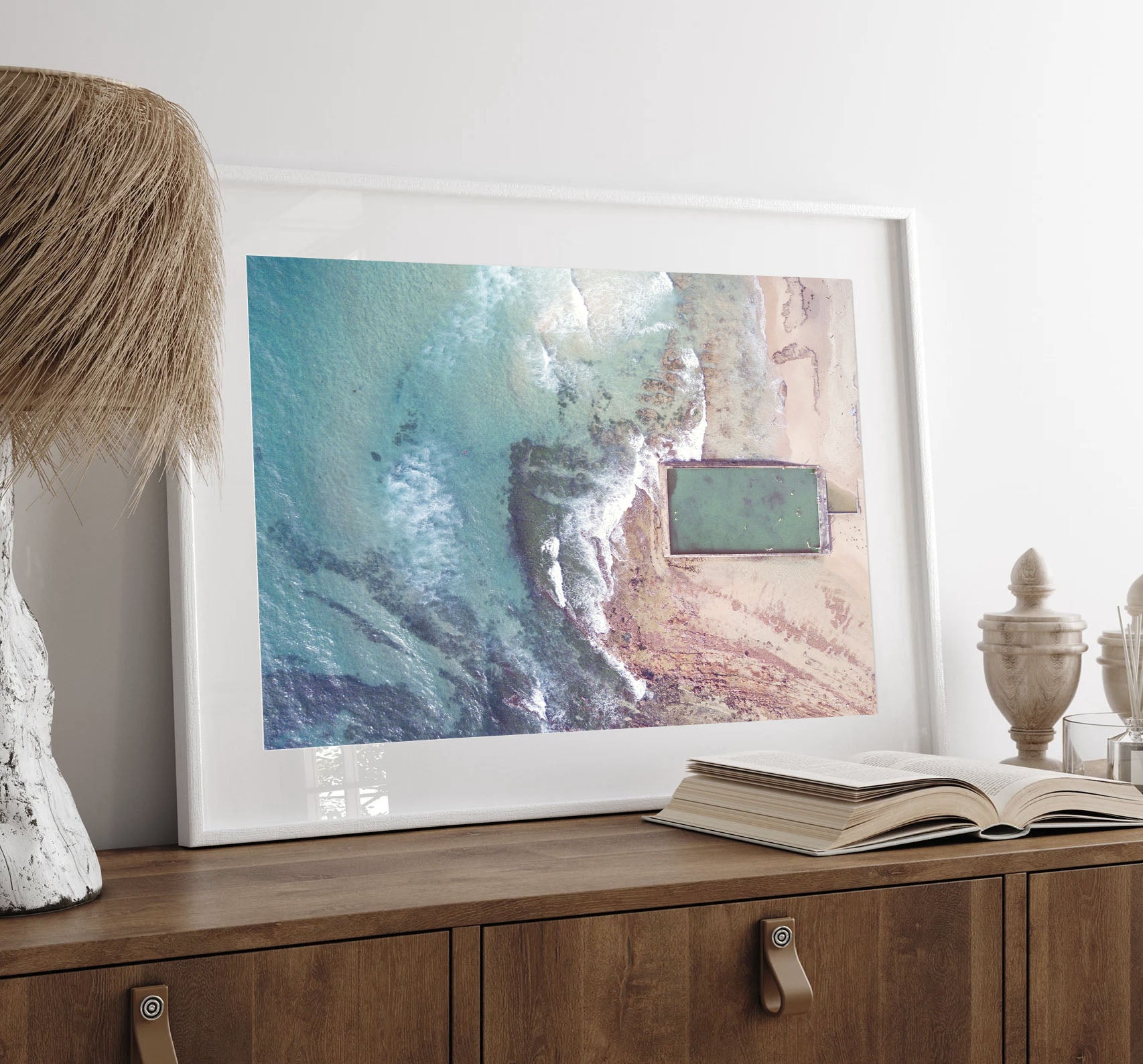 Aerial tones of turquoise and sand meet in this serene capture of Bulli's iconic rockpool at the end of Sandon Point Beach. The calm geometry of the pool contrasts beautifully with the movement of surrounding waves.