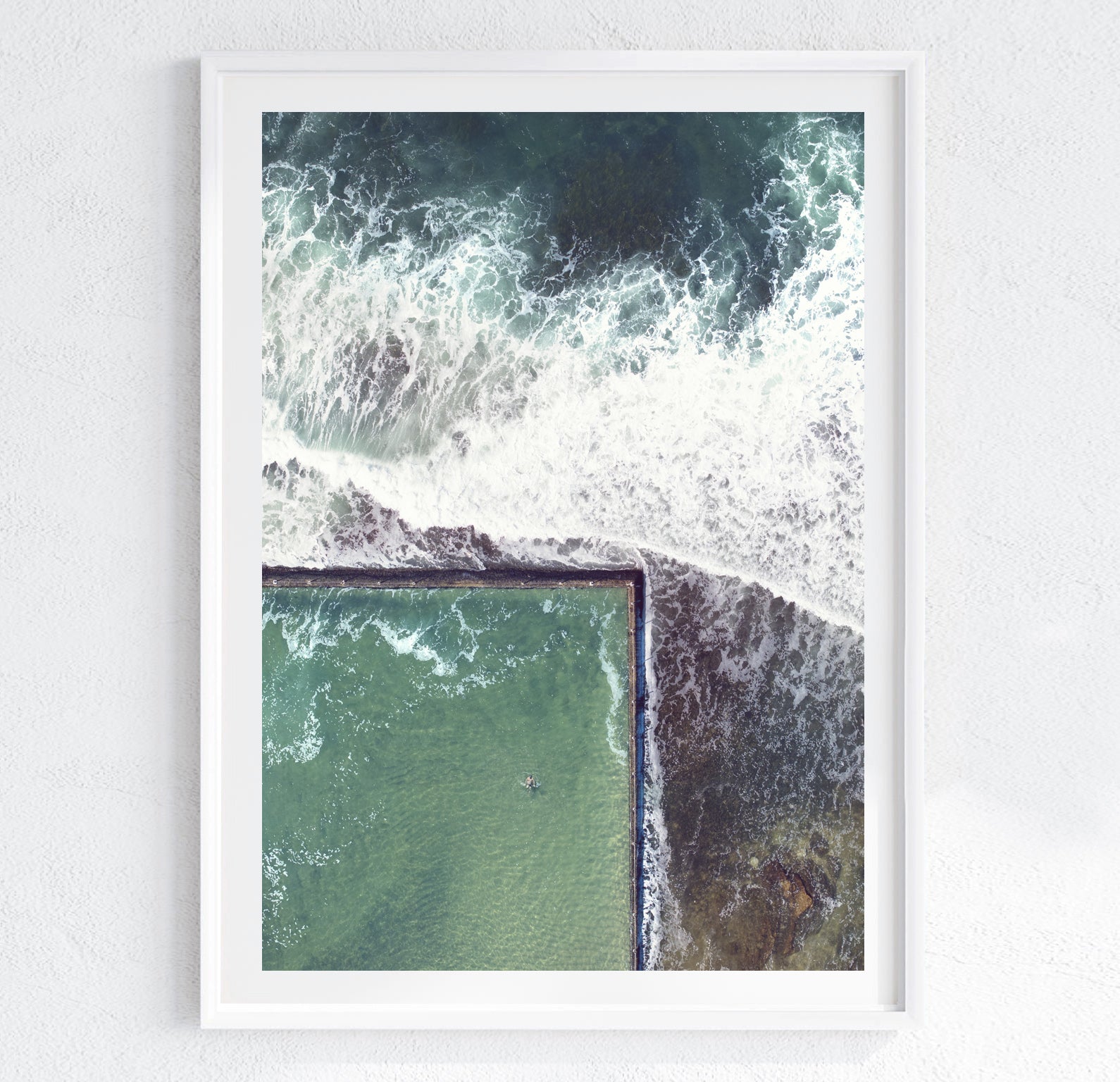 A lone swimmer carves a path through the clear turquoise calm of Shelly Beach Rockpool, framed by the rhythmic chaos of crashing waves beyond. A study in contrast and solitude from above.