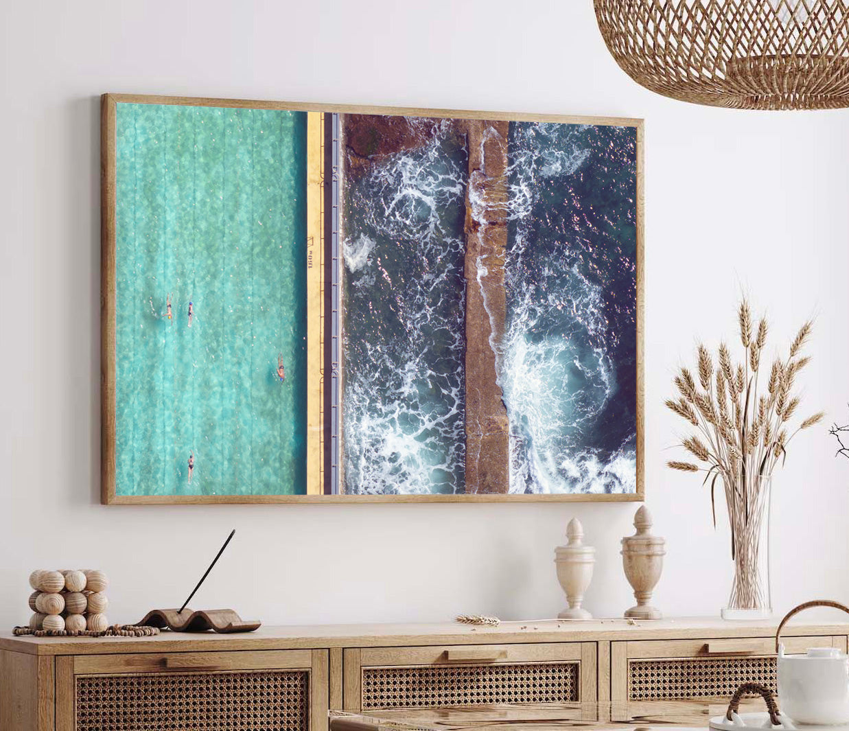 An aerial view that splits ocean from order, this piece captures swimmers gliding through the calm lanes of the pool, just metres from crashing waves. A study in balance between manmade structure and natural force.