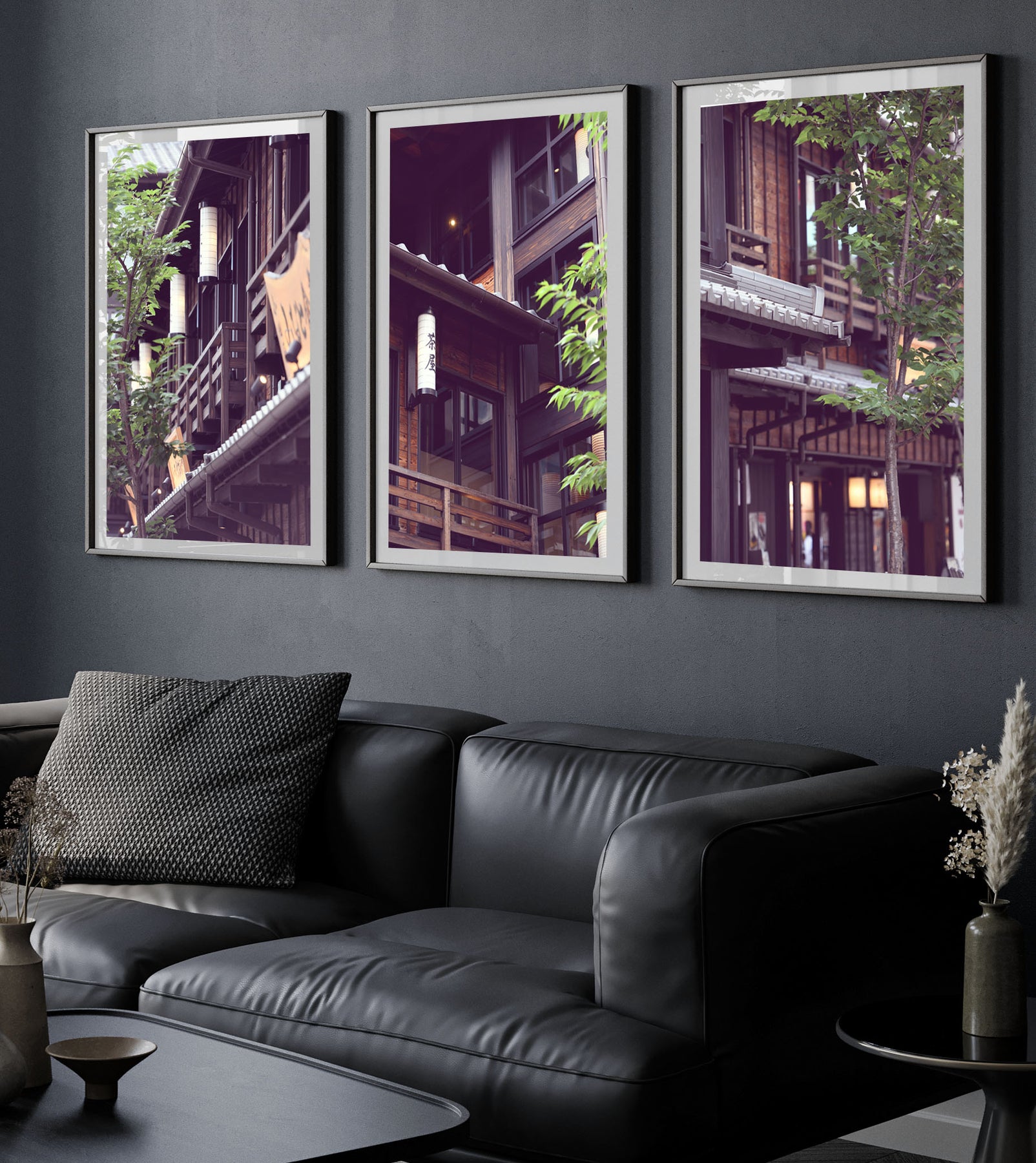 This trio showcases traditional craftsmanship in rural Japanese architecture. Timber frames, shoji-style panels, and tranquil greenery define each peaceful composition.