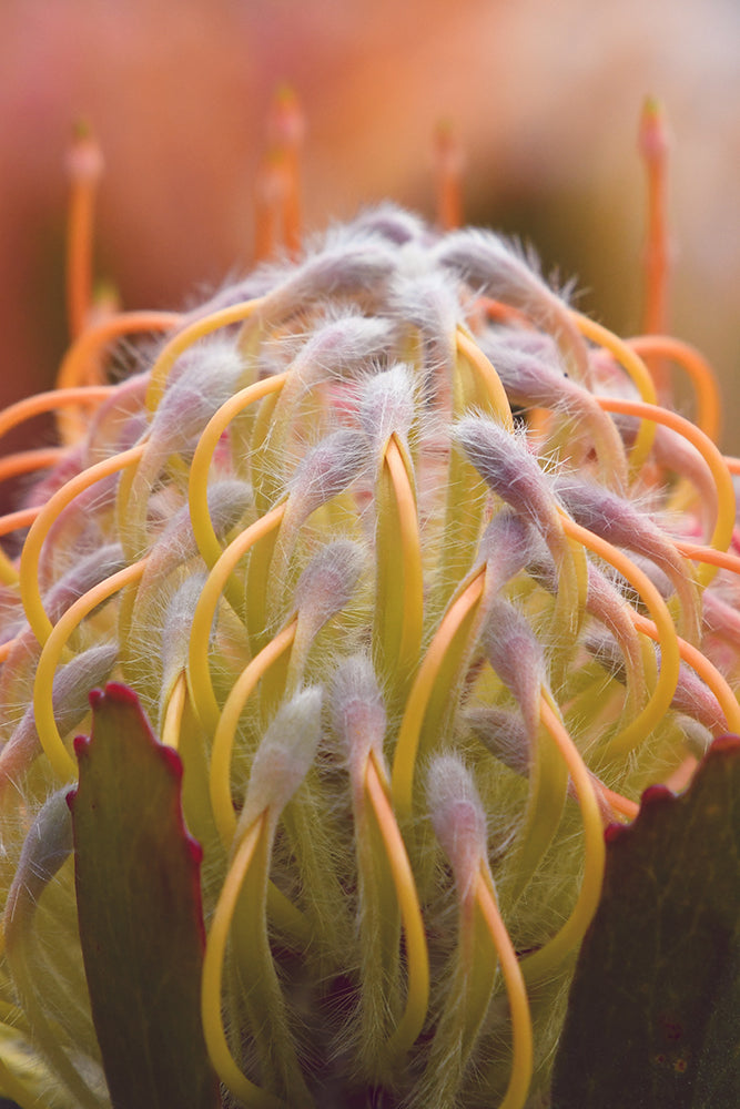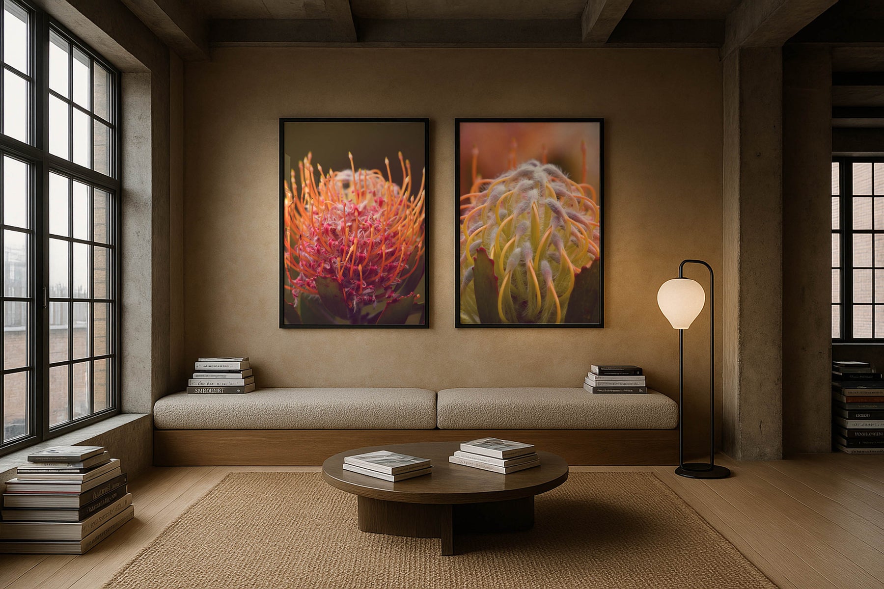 A vibrant celebration of the unique textures and vivid colours of the pincushion Protea. These bold close-ups highlight the intricate curls and fine hairs of this iconic bloom in all its sculptural beauty.