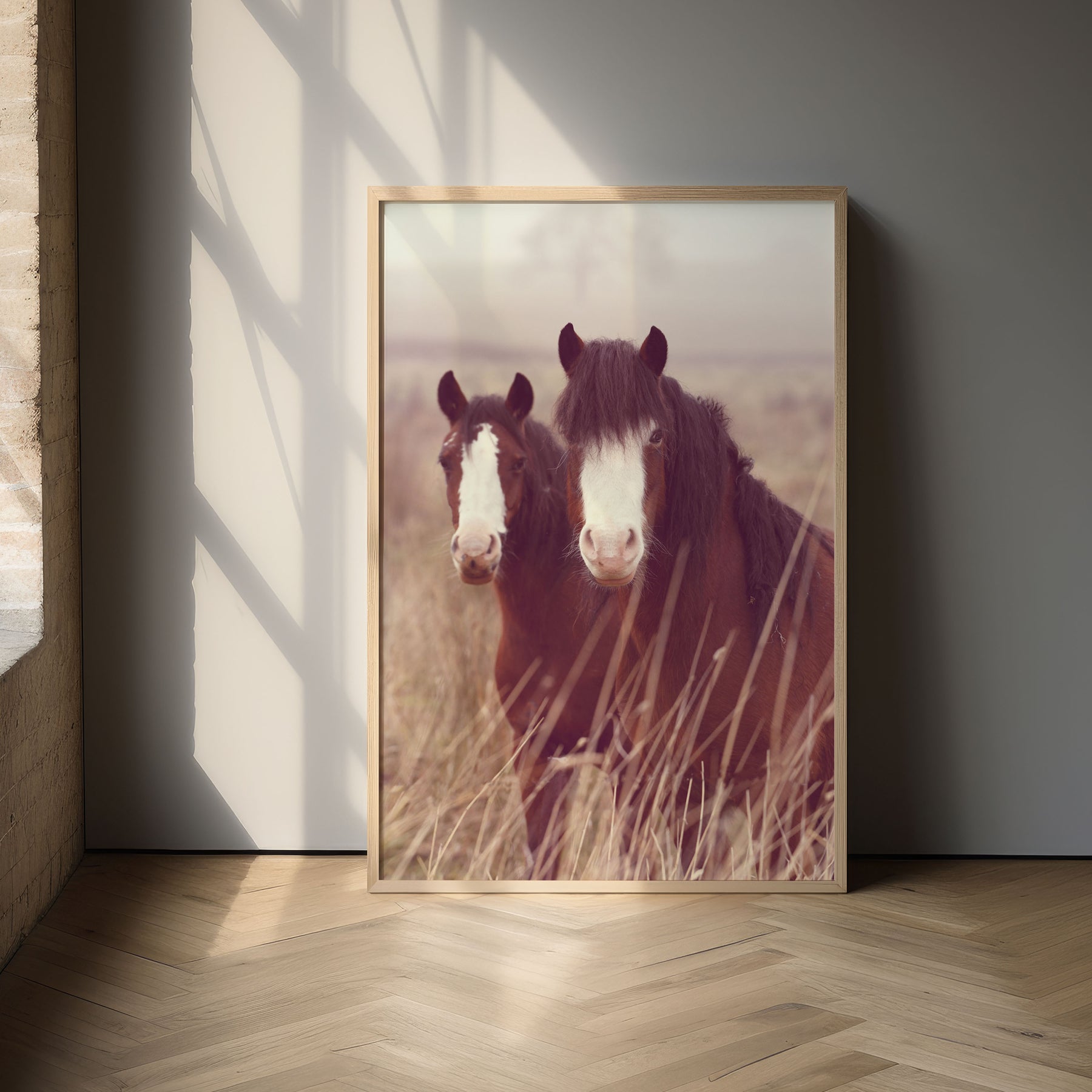 This gentle portrait of two chestnut horses standing in tall autumn grass evokes a quiet connection between the pair. Their white blazes and soft gazes emerge beautifully from the misty, neutral-toned background on a cold winters morning in the Southern Highlands of NSW.