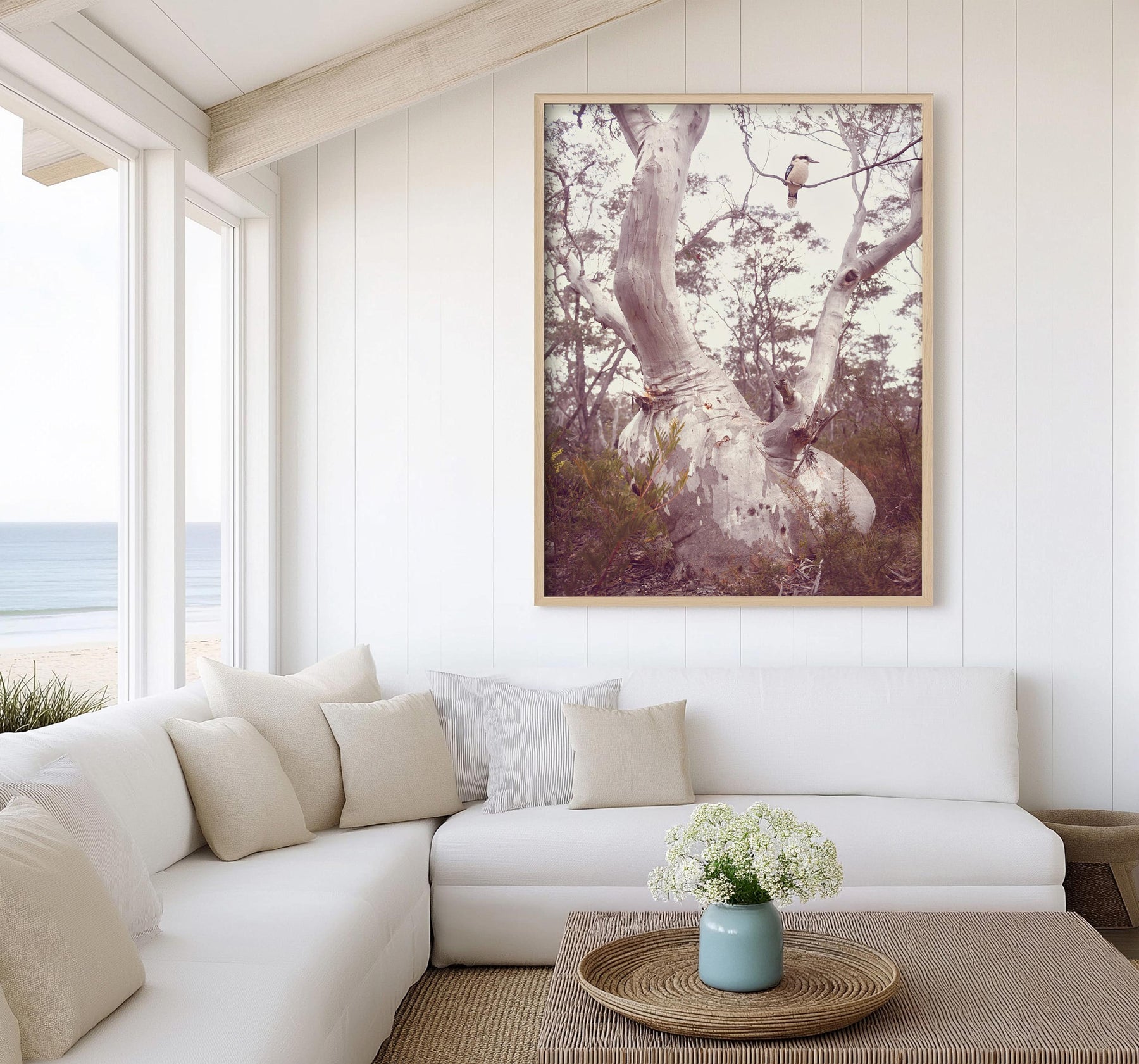 A lone kookaburra perches high on a winding ghost gum, set deep within the Australian bush. The curves of the pale bark mirror the bird’s quiet watchfulness in this beautifully composed portrait of stillness and strength.