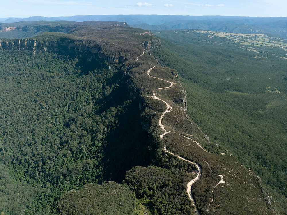 Aerial sunlight dances along the winding trail of Narrowneck Plateau, tracing the dramatic ridge between wilderness and sky in the Blue Mountains. This striking perspective captures the harmony between rugged terrain and soft horizon.