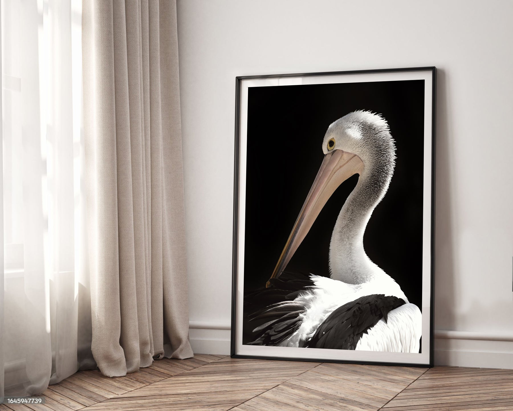 This striking portrait captures the elegance and quiet strength of the Australian pelican. Set against a rich black backdrop, Penny’s soft feathers and poised beak stand out in sharp detail.