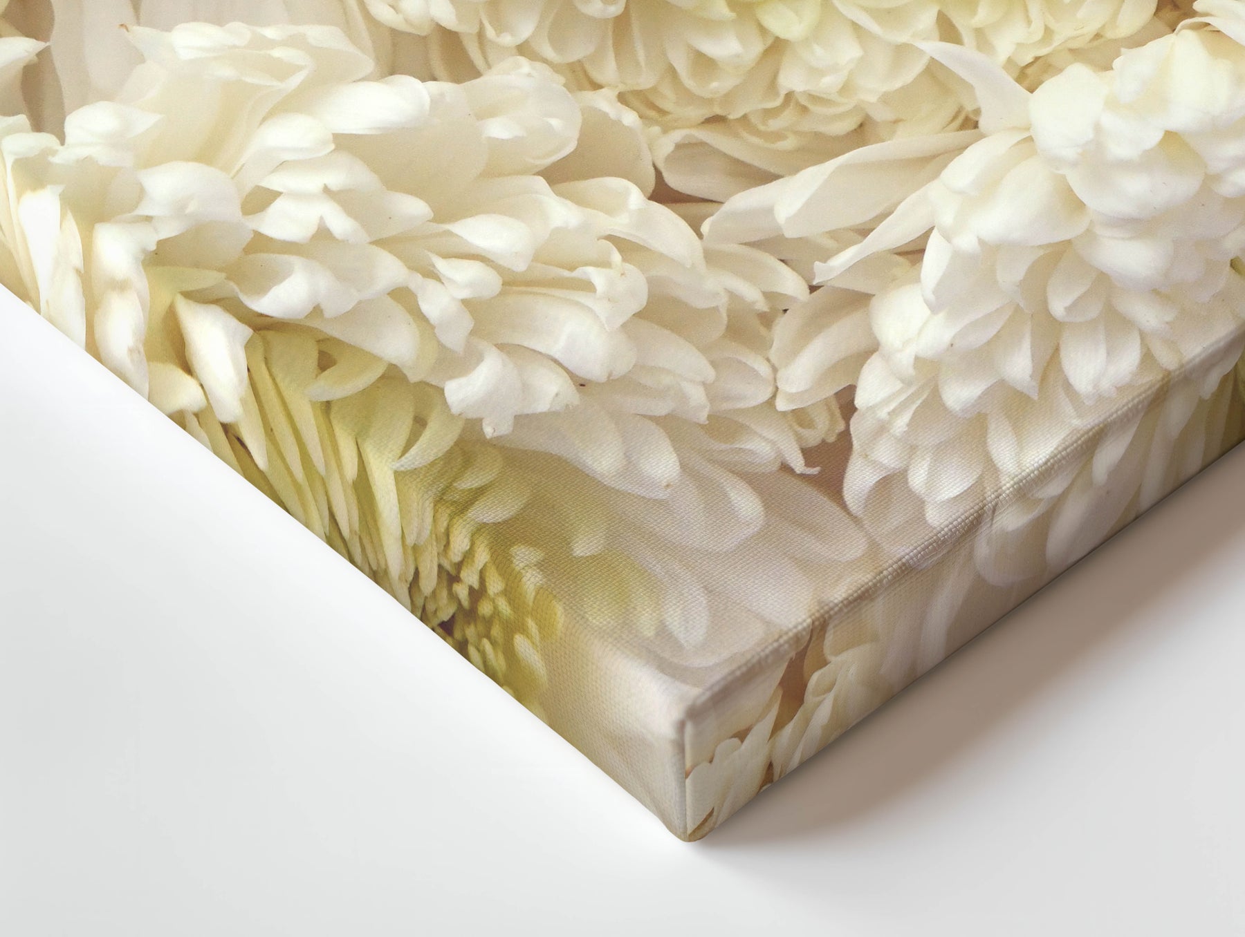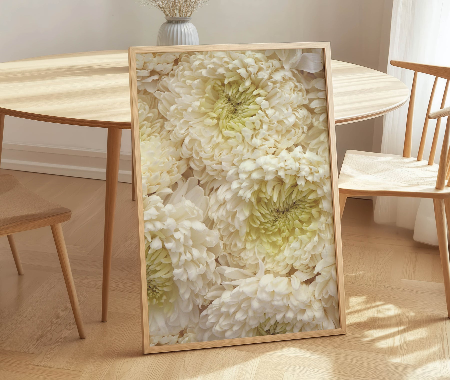 Billowy layers of white petals of this Peony Chrysanthemum unfold in this dreamy floral composition, evoking softness, calm, and quiet elegance. A serene celebration of form and texture that brings tranquillity to any space.